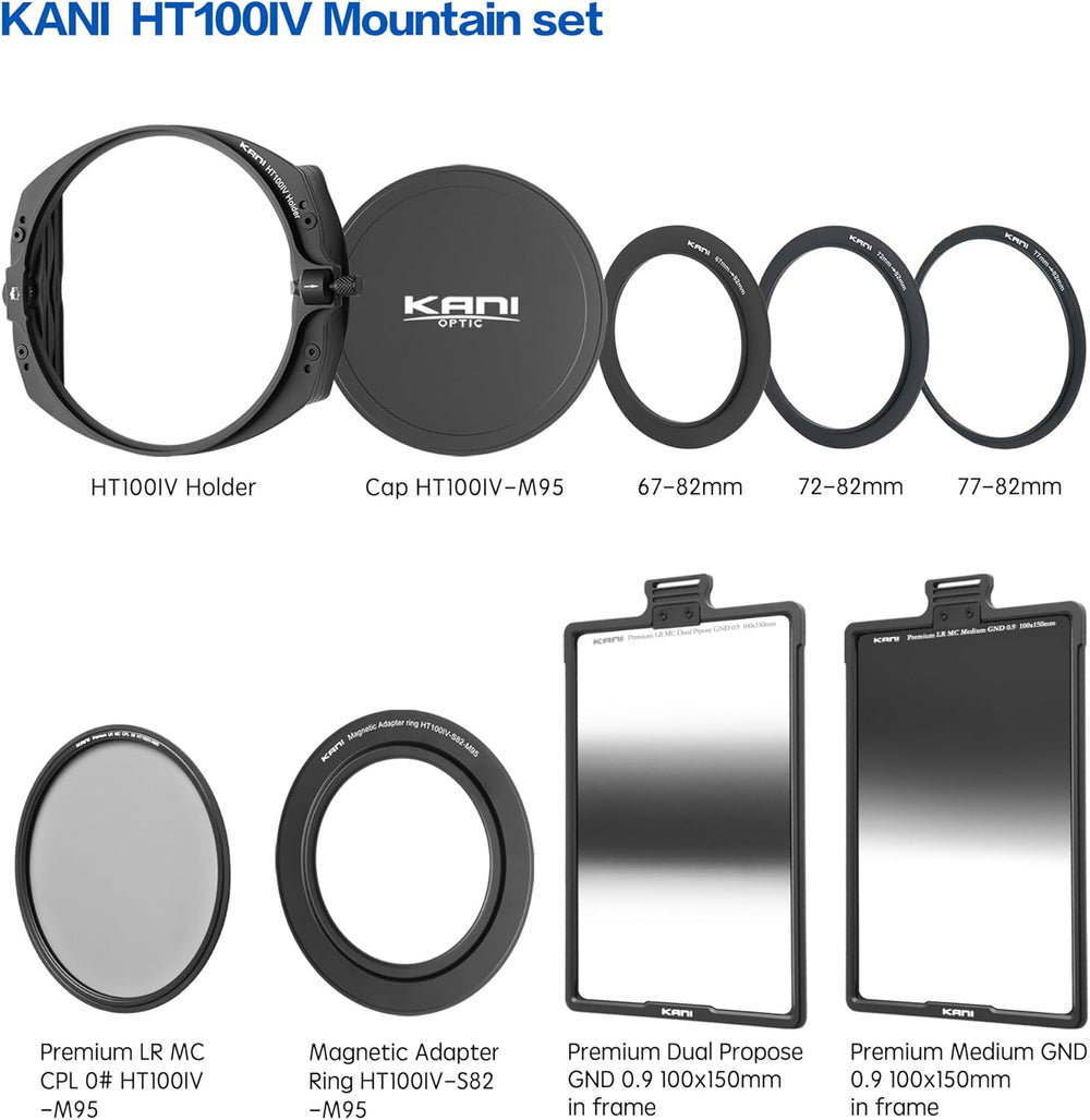 The KANI HT100 IV Mountain Starter Set is a lightweight, high-performance filter kit specially curated for mountain photography. This set allows you to manage extreme contrast conditions found in high-altitude shooting—such as ridgelines against bright skies—without compromising on portability.